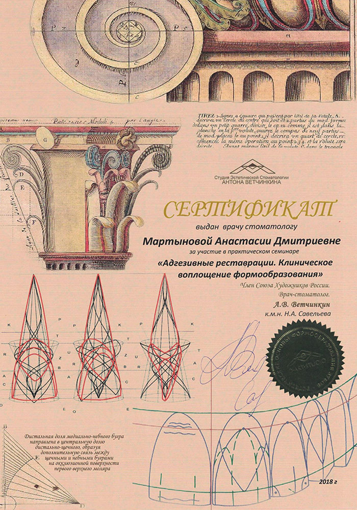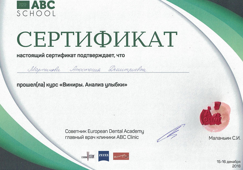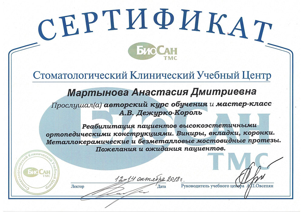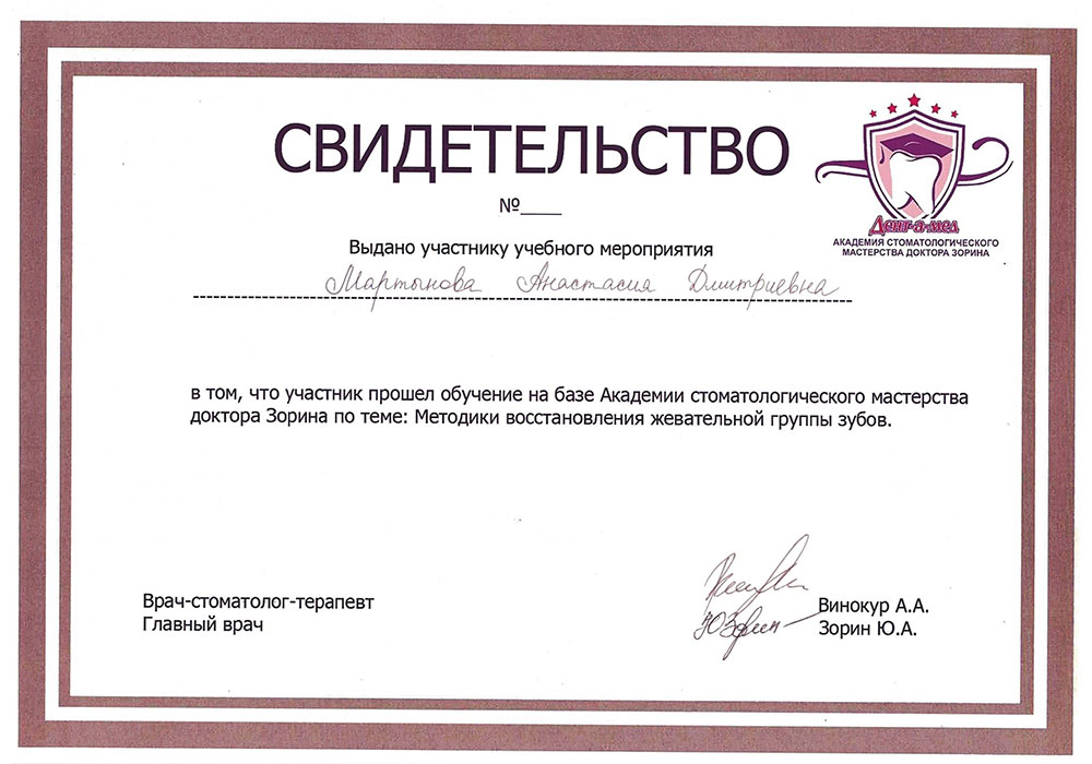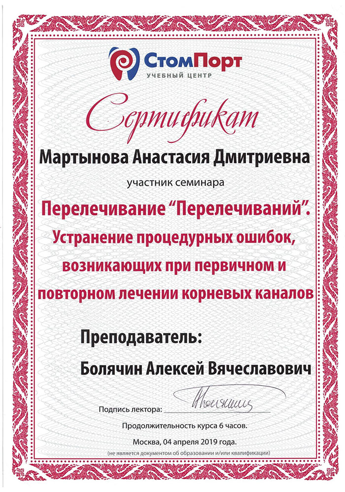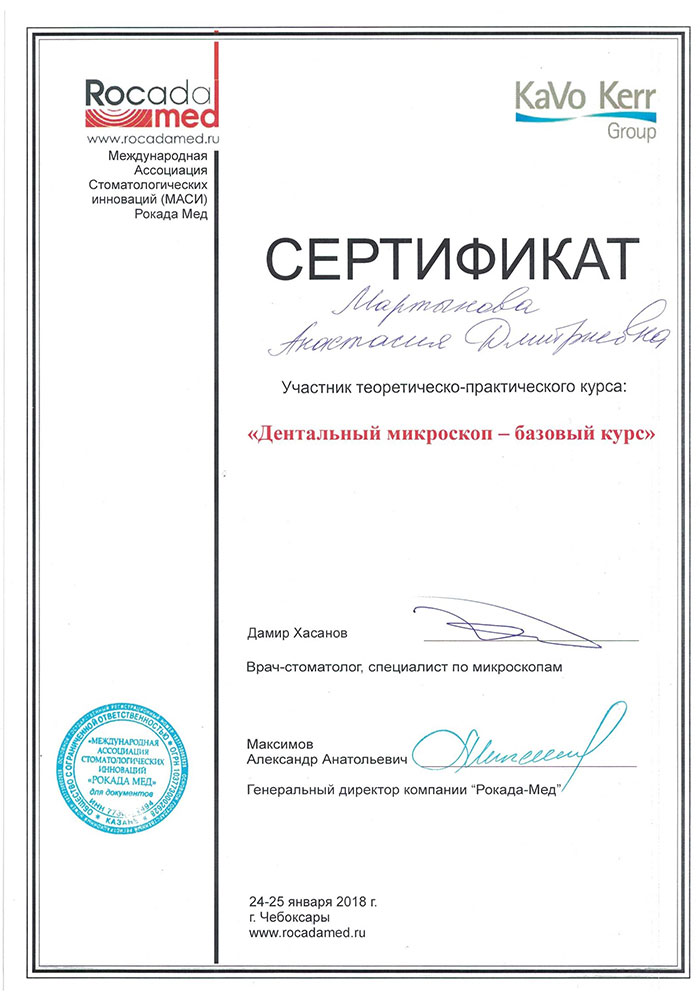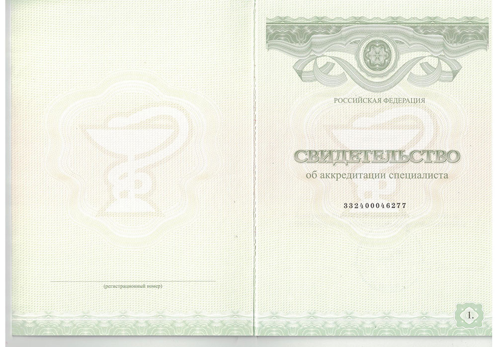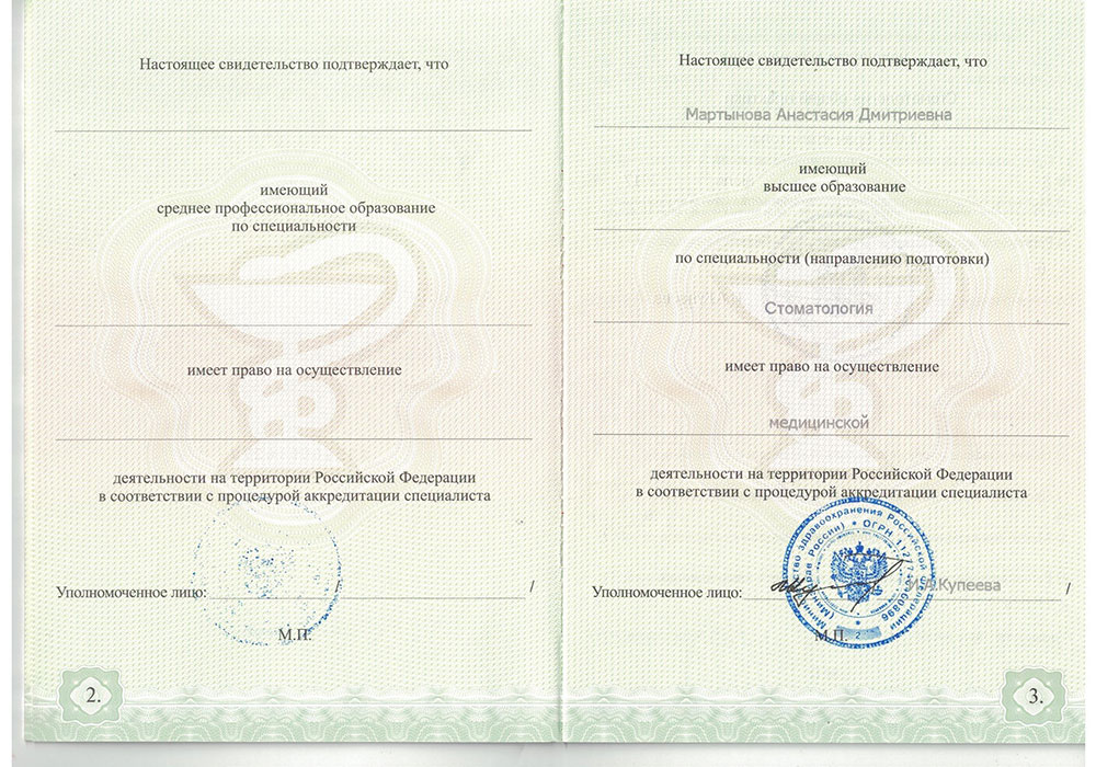 - Свидетельство об аккредитации специалиста 332400046277 от 06.07.2017 г. Федеральное государственное бюджетное образовательное учреждение высшего образования "Чувашский государственный университет имени И.Н. Ульянова" по специальности "Стоматология общей практики".
