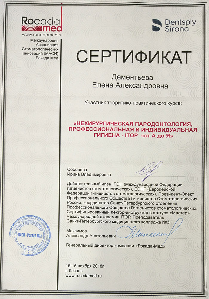 - Сертификат специалиста 0152310328859 от 05.10.2018 г. Федеральное государственное бюджетное образовательное учреждение высшего образования "Приволжский исследовательский медицинский университет" Министерства здравоохранения Российской Федерации по специальности "Стоматология".