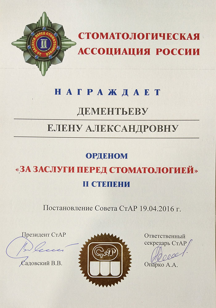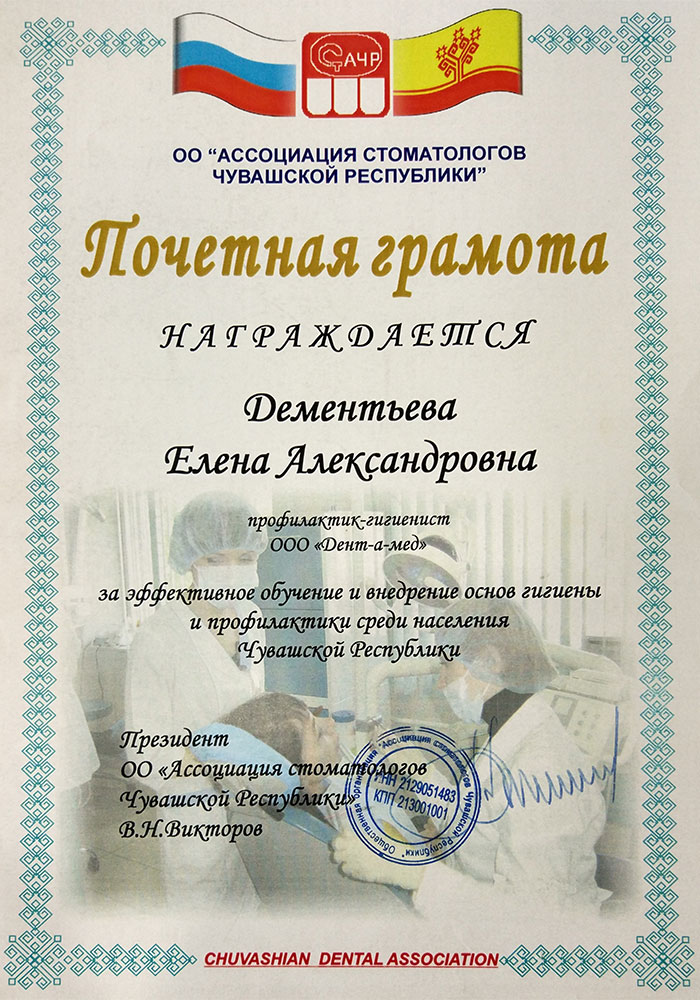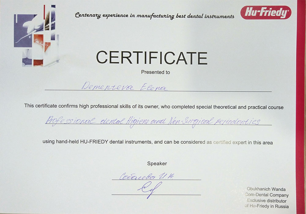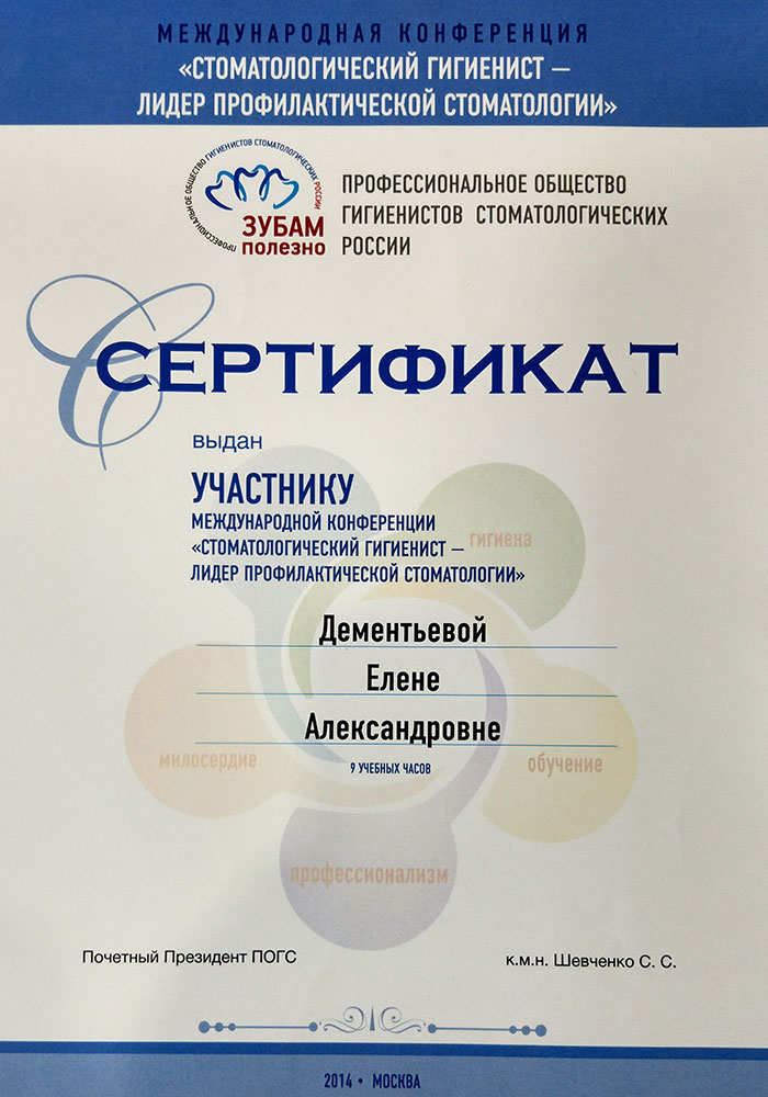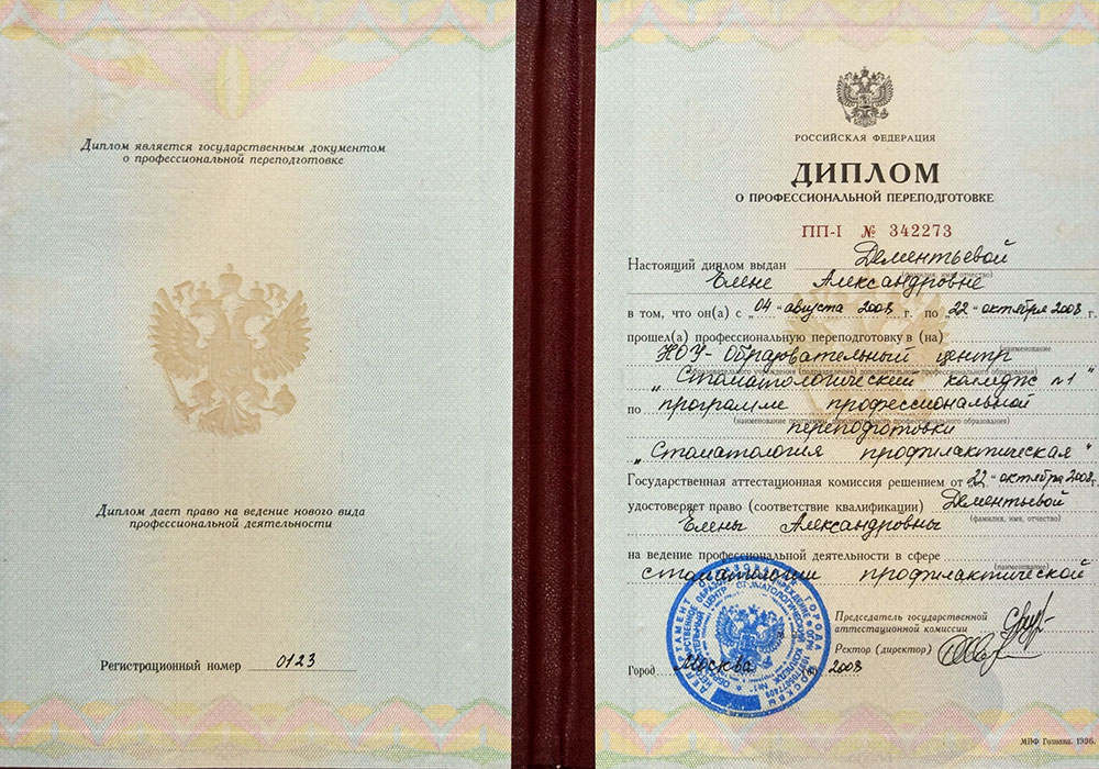 - Диплом о профессиональной переподготовке ПП-I №342273 от 22.10.2008 г. НОУ-Образовательный центр "Стоматологический колледж №1" по программе профессиональной переподготовки "Стоматология профилактическая".