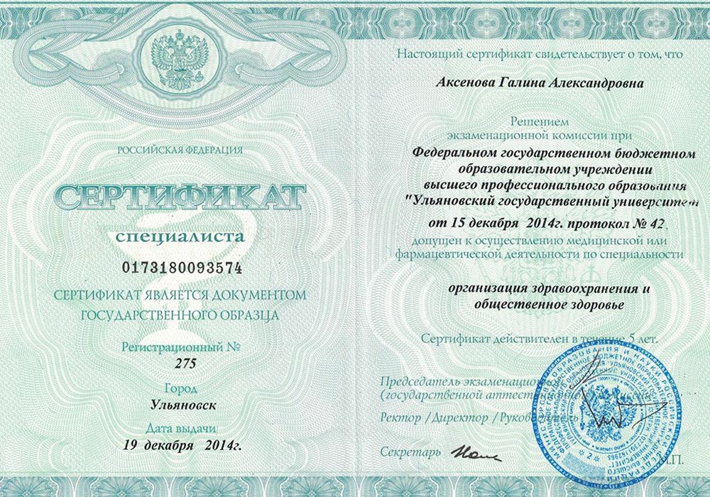 - Сертификат специалиста 0173180093574 от 19.12.2014 г. Федеральное государственное бюджетное образовательное учреждение высшего профессионального образования "Ульяновский государственный университет" по специальности "Организация здравоохранения и общественное здоровье".