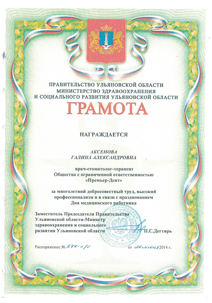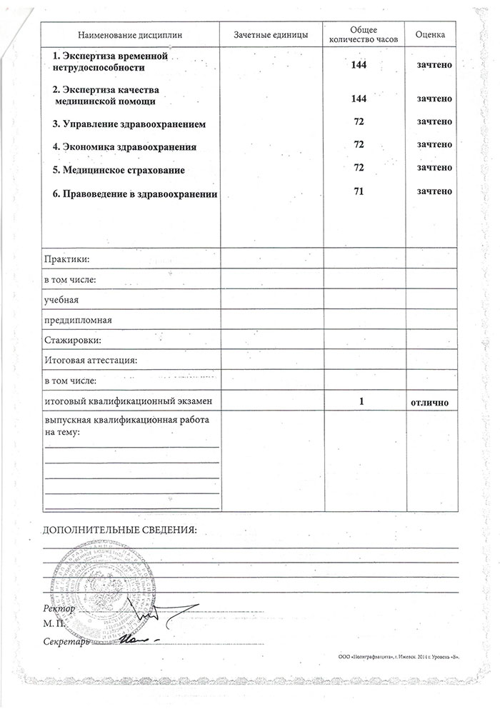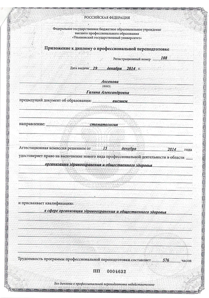- Диплом о профессиональной переподготовке ПП 0004632 от 19.12.2014 г. Федеральное государственное бюджетное образовательное учреждение высшего профессионального образования "Ульяновский государственный университет" присвоена квалификация "Врач в сфере организации здравоохранения и общественного здоровья".