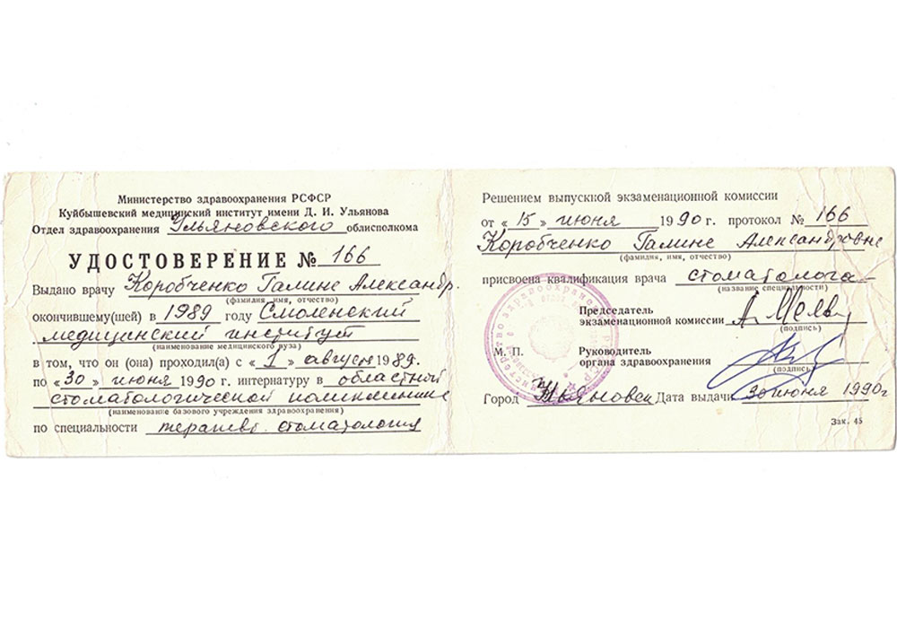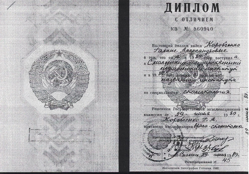 Диплом с отличием КВ №560940 от 29.06.1989 г. "Смоленский государственный медицинский институт" по специальности "Стоматология" присвоена квалификация врача-стоматолога.