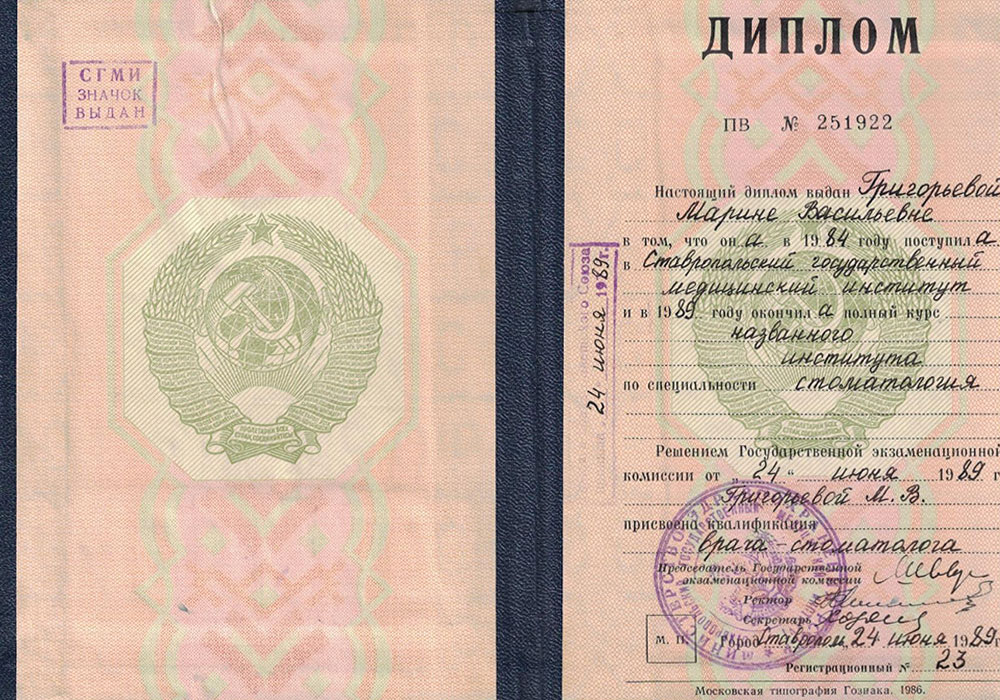 - Диплом ПВ №251922 от 24.06.1989 г. "Ставропольский государственный медицинский институт" присвоена квалификация "Врача-стоматолога".