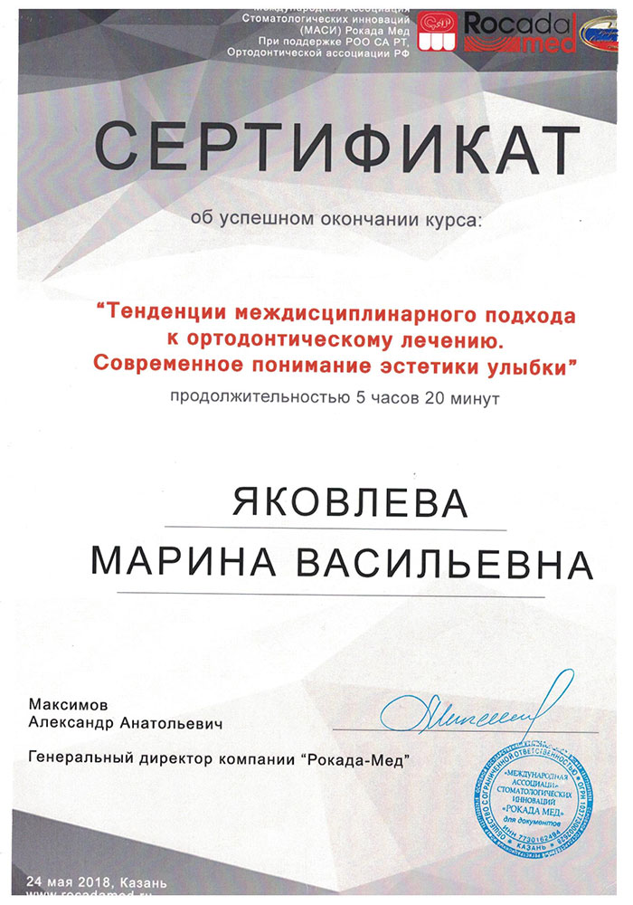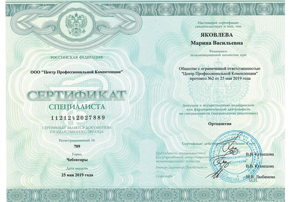 - Сертификат специалиста 1121242027889 от 25.05.2019 г. ООО "Центр Профессиональной Компетенции" по специализации "Ортодонтия".