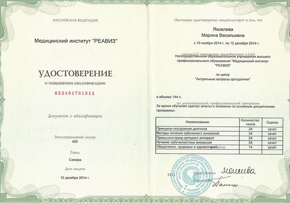 - Удостоверение о повышении квалификации 632401781811 от 12.12.2014 г. Негосударственное образовательное учреждение высшего профессионального образования "Медицинский институт "РЕАВИЗ" по циклу "Актуальные вопросы ортодонтии".