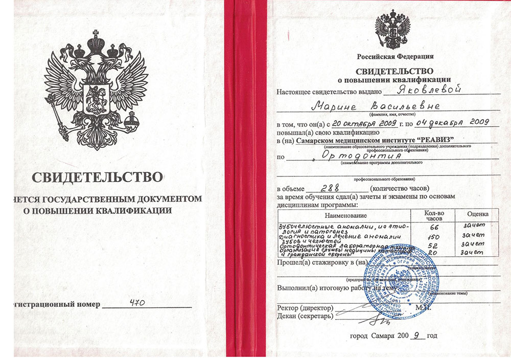 - Свидетельство о повышении квалификации №470 от 04.12.2009 г. "Самарский медицинский институт "РЕАВИЗ" по "Ортодонтии".