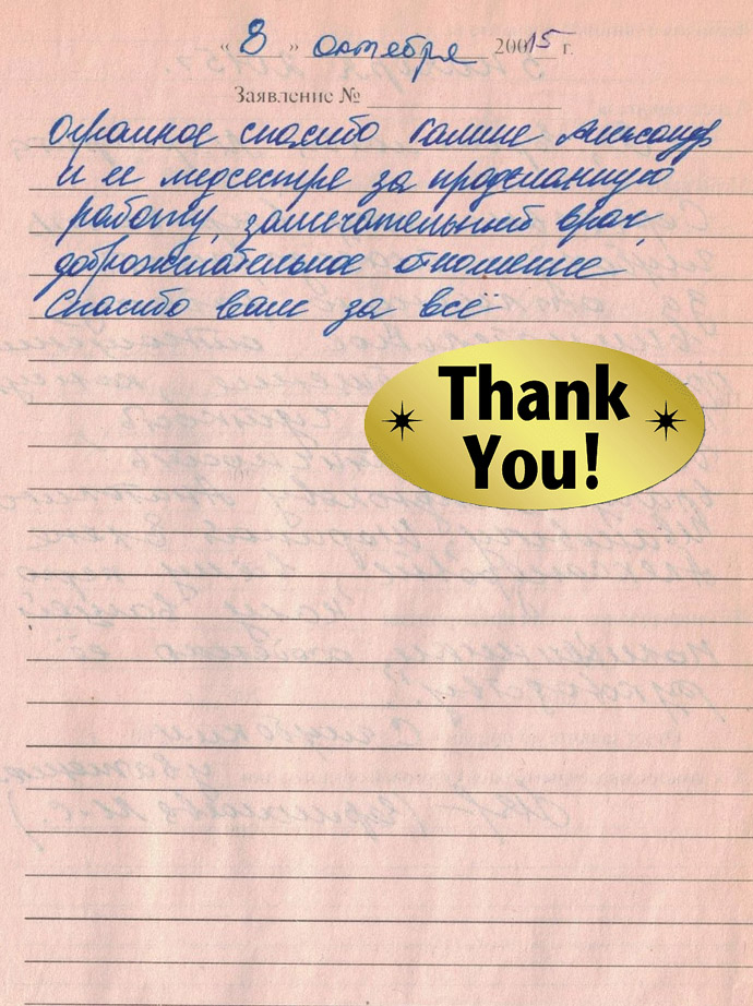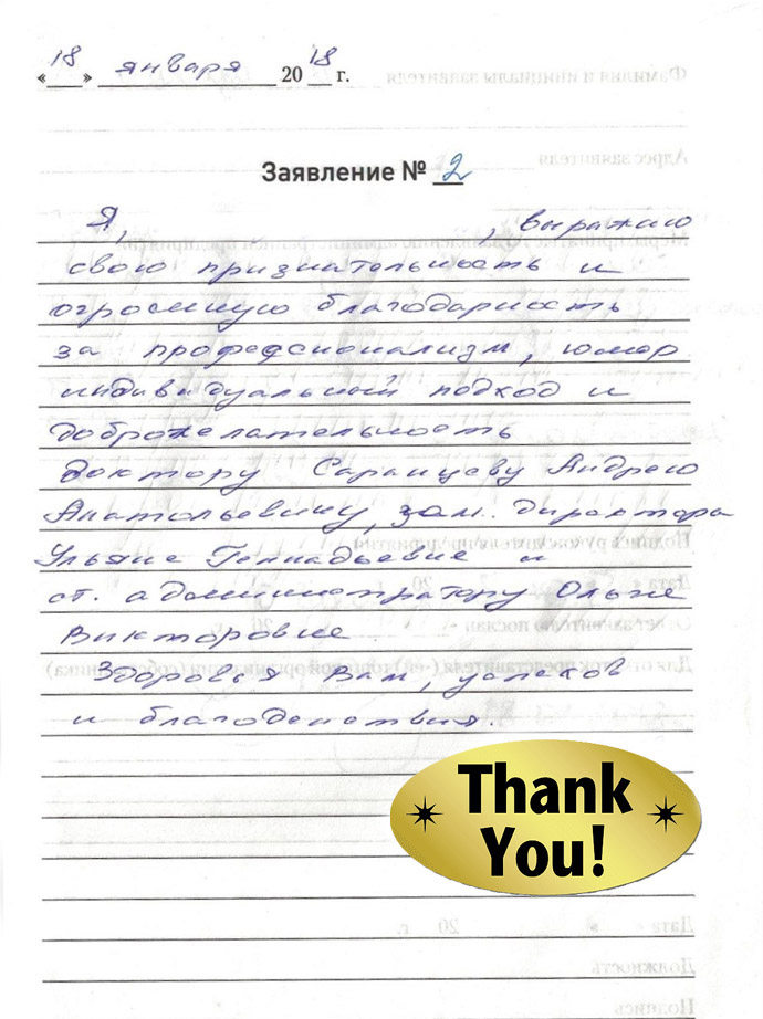 Я, выражаю свою признательность и огромную благодарность за профессионализм, юмор, индивидуальный подход и доброжелательность доктору Саранцеву Андрею Анатольевичу, зам. директора Ульяне Геннадьевне и ст. администратору Ольге Викторовне.