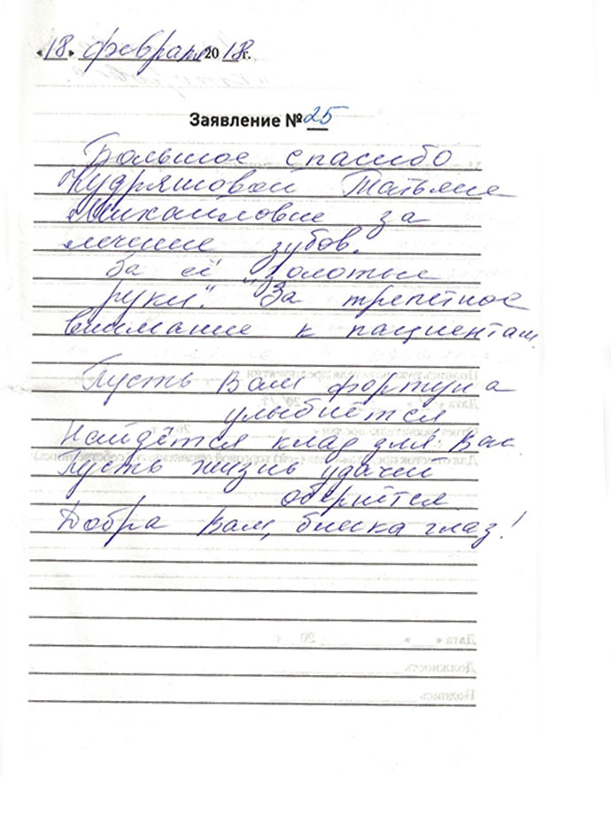 Большое спасибо Кудряшовой Татьяне Михайловне за лечение зубов. За её "золотые руки". За трепетное внимание к пациентам. Пусть Вам фортуна улыбнётся,найдётся клад для Вас. Пусть жизнь удачей обернётся, добраВам, блеска...