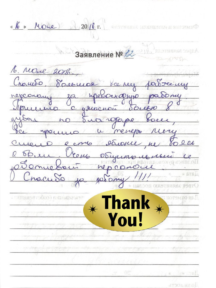 Спасибо большое всему рабочему персоналу за превосходную работу. Пришла с ужасной болью зуба, но благодаря Вам все прошло и теперь могу смело есть яблоки, не боясь боли. Очень общительный и заботливый персонал. Спасибо за...
